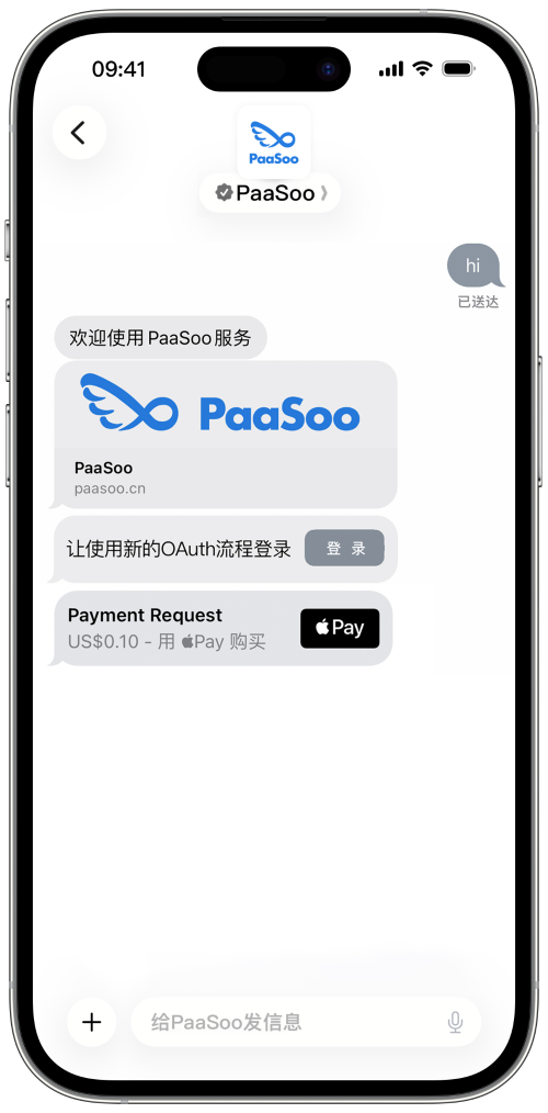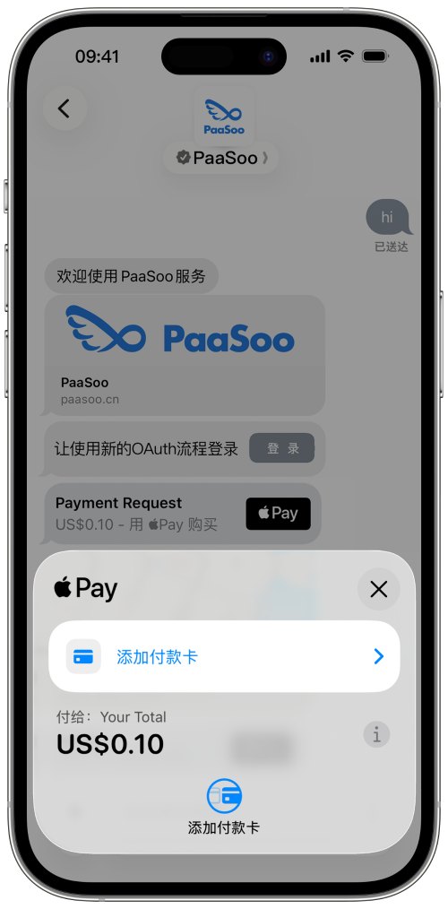 通过 Apple Pay (面容 ID/触控 ID) 一键支付——安全、合规且无缝。无需跳转,无需输入卡号。将对话转化为营收。
