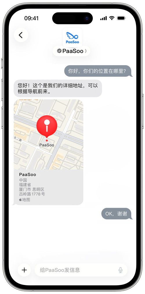 在聊天中显示门店详情,如地址、营业时间和联系方式。