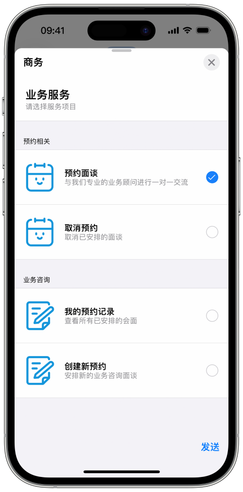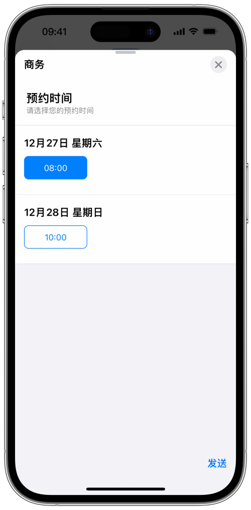 告别单调的纯文本,利用 Apple 的高保真(High-fidelity)信息功能。 使用列表选择器、时间选择器和富链接逐步 引导用户——让用户在“信息” App 内即可完成咨询、选择和决策。